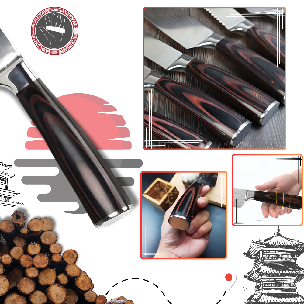 Realizzati in legno di pakkawood, i manici di ogni coltello giapponese in legno Pakkawood sono progettati per resistere ai rigori delle cucine domestiche e professionali. Il legno di pakkawood è noto per la sua eccezionale resistenza all'umidità e per la sua robustezza, che lo rende un materiale ideale per i manici dei coltelli che richiedono durata e igiene. Il design ergonomico dell'impugnatura garantisce una presa sicura anche in condizioni di umidità, aumentando la sicurezza e il controllo durante l'uso. La durata garantisce che ogni coltello non solo resista alla prova del tempo, ma mantenga anche il suo fascino estetico, rendendo questo set di coltelli giapponesi un mix di praticità e lusso negli utensili da cucina.