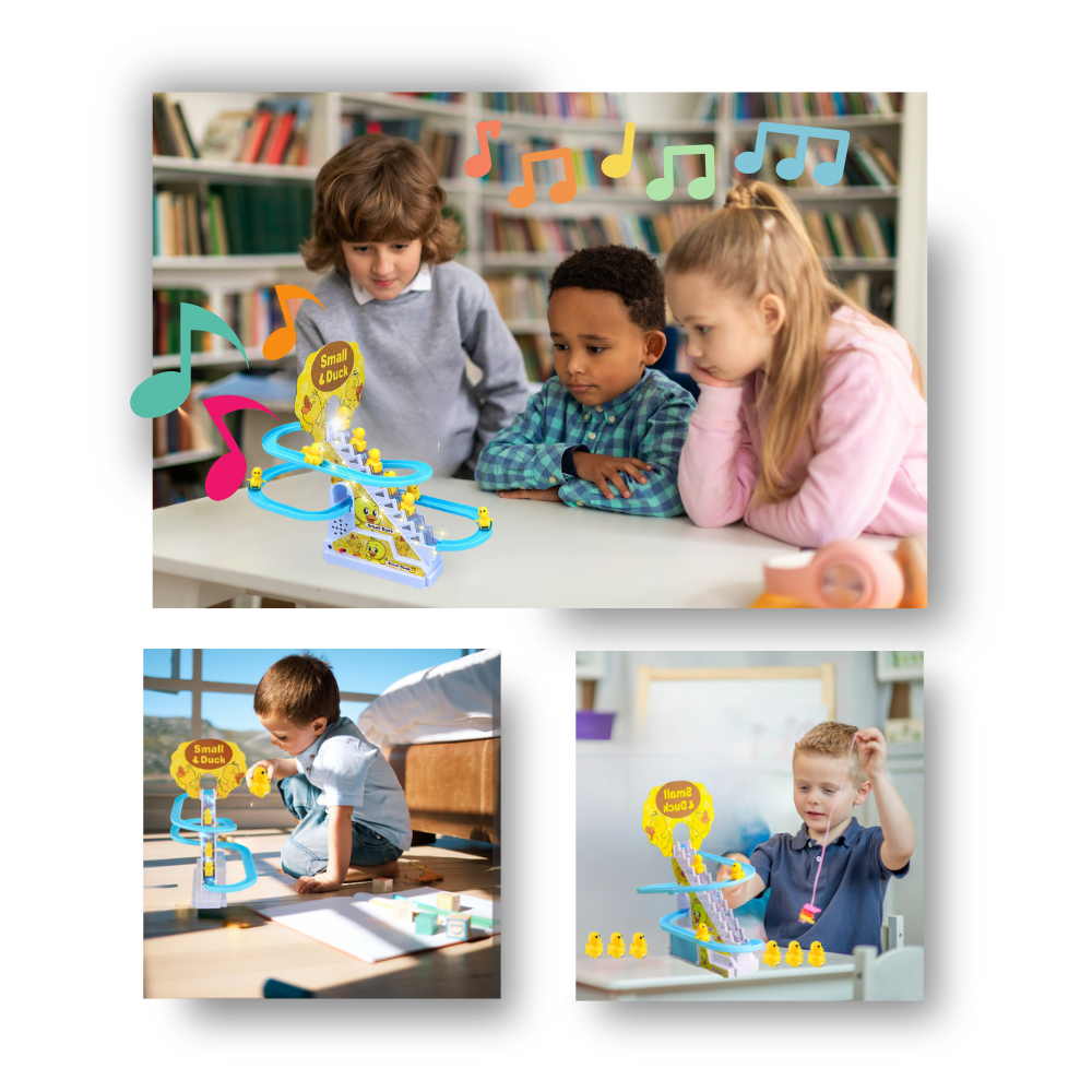 Nel mondo caotico di oggi, mantenere l'attenzione dei bambini è una vera sfida. La pista di scivolo delle anatre elettriche affronta questa sfida offrendo un'esperienza visivamente accattivante che cattura e trattiene l'interesse dei bambini. Con colori vivaci e movimenti dinamici, questo giocattolo si distingue tra le molteplici distrazioni presenti. Il divertimento delle anatre che salgono le scale e scivolano giù dallo scivolo, accompagnato dalle luci LED lampeggianti, non solo aggiunge un tocco magico al gioco, ma gioca anche un ruolo fondamentale nel mantenere alta l'attenzione dei piccoli giocatori. Questo design accattivante fa sì che i bambini non siano solo intrattenuti, ma anche immersi in un ambiente di apprendimento interattivo, dove la stimolazione visiva supporta sia il gioco che la crescita dello sviluppo.